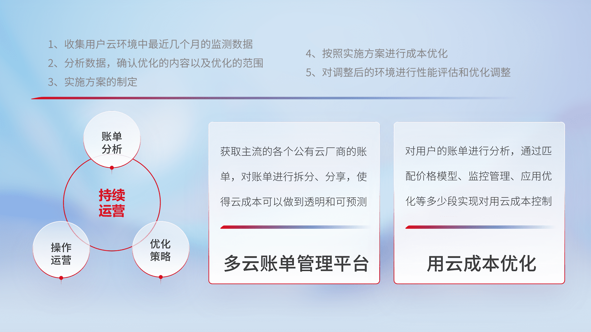 通过多云纳管,,以统一的资源数据模型把客户的云资源进行抽象和封装,,,进而实现对多云资源的统一操作,,,保障云资源管理的可靠性、、、稳定性与可用性。。量身定制化运维内容,,,配置、、、开发运维、、、、补丁管理、、、备份、、、监控、、、认证和访问管理、、、、审计和日常巡检等,,保障在用云过程中的可靠度,,稳定度以及高可用率。。。